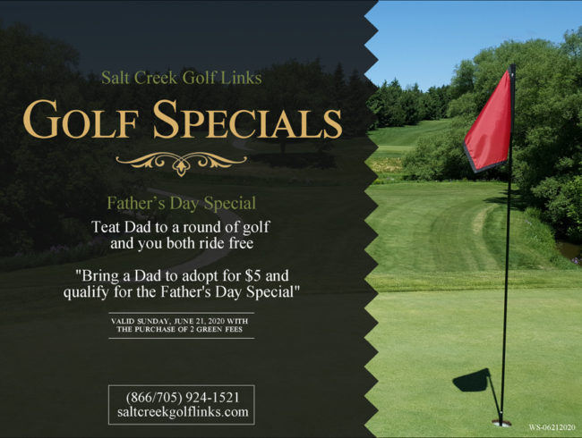 Treat Dad to a round of golf and you both ride free. Bring a Dad to adopt for $5 and qualify for the Father's Day Special. Valid Sunday, June 21, 2020 with the purchase of 2 green fees.
